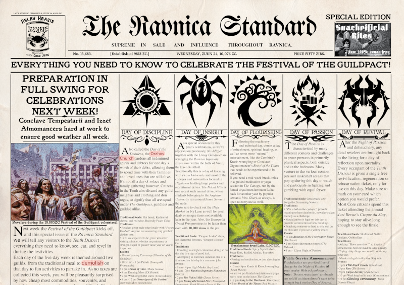 We realized that there where encoded messages inside The Ravnica Standard. Looking back we realized that this went several issues back and there where someone instructing someone to cause destruction to the current formation of the Guild Pact. The living Guild Pact, Jace, was still missing at this point (he had been missing since we started playing).